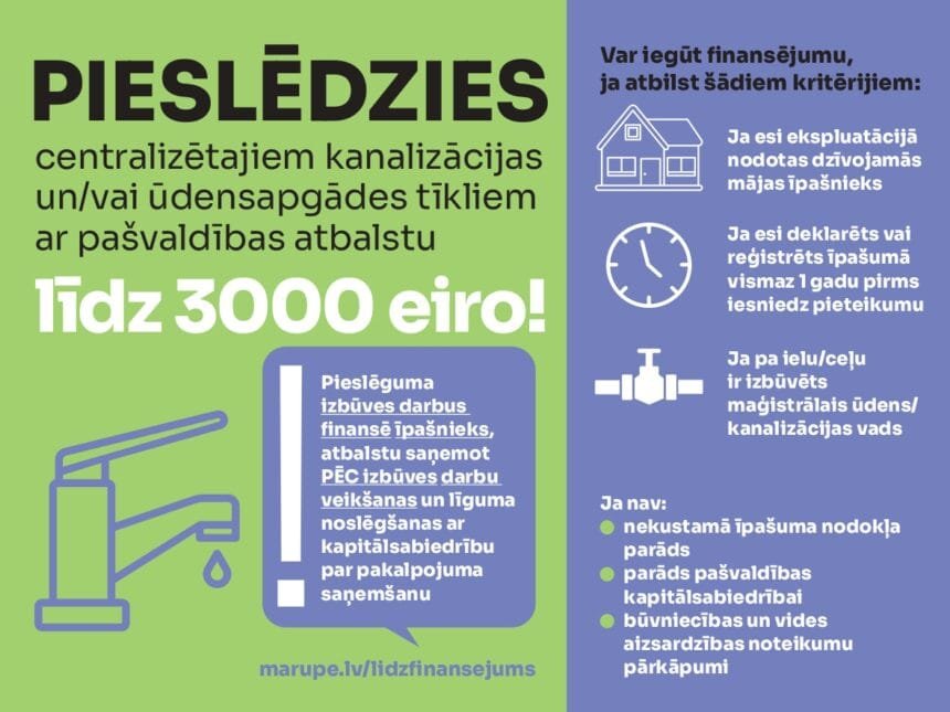 Pašvaldības atbalsts paredz iespēju saņemt finansējumu par pieslēgumu izbūvi pie centralizētās ūdensapgādes un kanalizācijas sistēmas