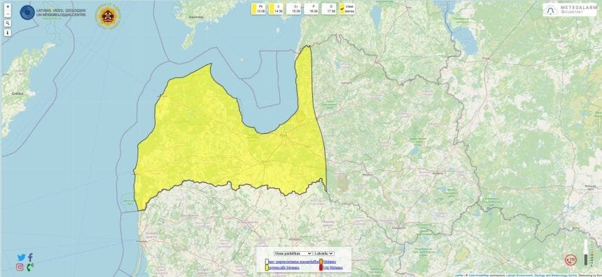 Latvijas Vides ģeoloģijas un meteoroloģijas centrs (LVĢMC) šovakar un naktī izsludinājis dzelteno brīdinājumu par stiprām lietusgāzēm Latvijas rietumu un centrālajos rajonos.