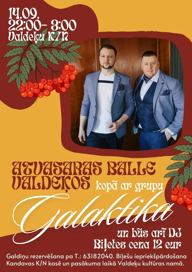 14. septembrī no plkst. 22:00 līdz 3:00 Valdeķu kultūras namā ATVASARAS GROZIŅBALLE VALDEĶOS. Spēlēs grupa GALAKTIKA un būs arī DJ.