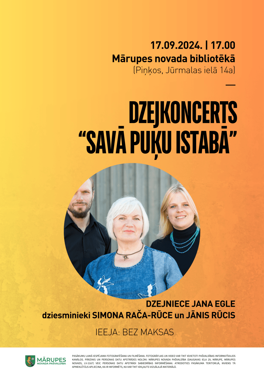 17. septembrī 17.00 Mārupes novada bibliotēkā (Piņķos, Jūrmalas ielā 14a) par godu Piņķu bibliotēkas jubilejām (10 gadi Babītes Kultūrizglītības centra telpās un 20 gadi kopš reģistrēta Kultūras ministrijas Bibliotēku reģistrā), aicinām lasītājus svinēt, klausoties mūziku, dzeju un stāstījumu par latviešu iecienītās autores Janas Egles grāmatām. Pēc koncerta – brīvas sarunas ar māksliniekiem un bibliotekārēm pie tējas tasītes.
