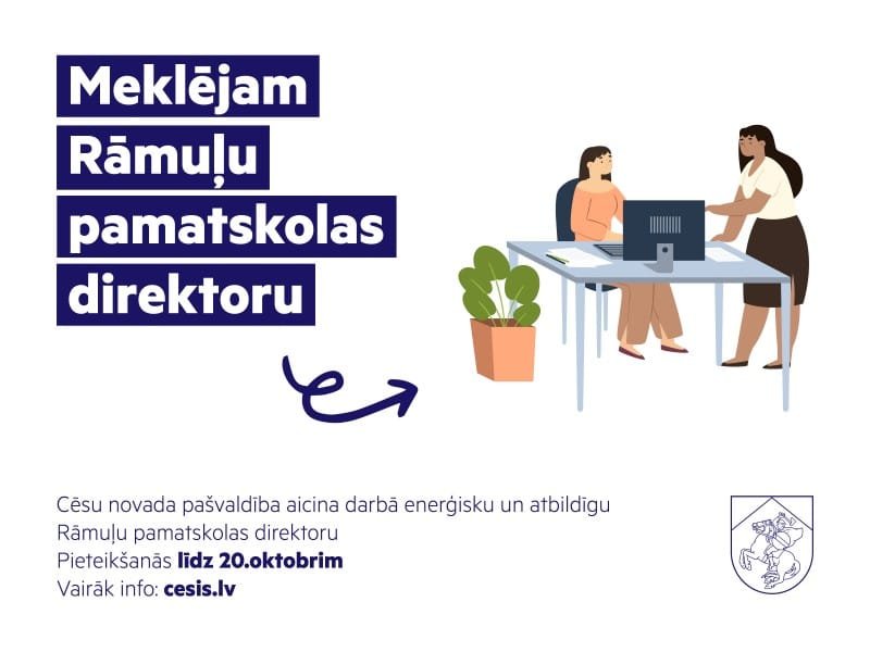 - pieteikumu (motivācijas vēstuli, CV (pretendenta dzīves un darba gaitu apraksts)) ar norādi “Rāmuļu pamatskolas direktors” parakstītu ar drošu elektronisko parakstu, iesūtīt līdz 2024.gada 20.oktobrim uz e-pasta adresi: vakances@cesunovads.lv