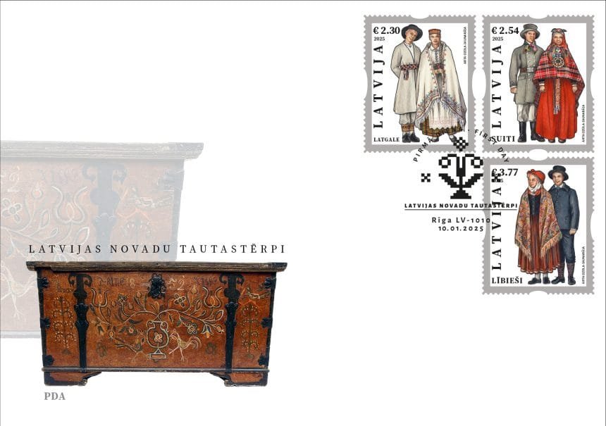 Latvijas Pasts izdevis šī gada pirmās trīs pastmarkas un īpašo aploksni, papildinot tradicionālo Latvijas novadu tautastērpu sēriju ar suitu, lībiešu un Latgalei raksturīgo tautastērpu unikalitāti. Filatēlijas izdevumu dizaina autore ir māksliniece Arta Ozola-Jaunarāja, kura uzkrājusi lielu pieredzi pastmarku izveidē, tai skaitā arī Latvijas novadu tautastērpu sērijā.