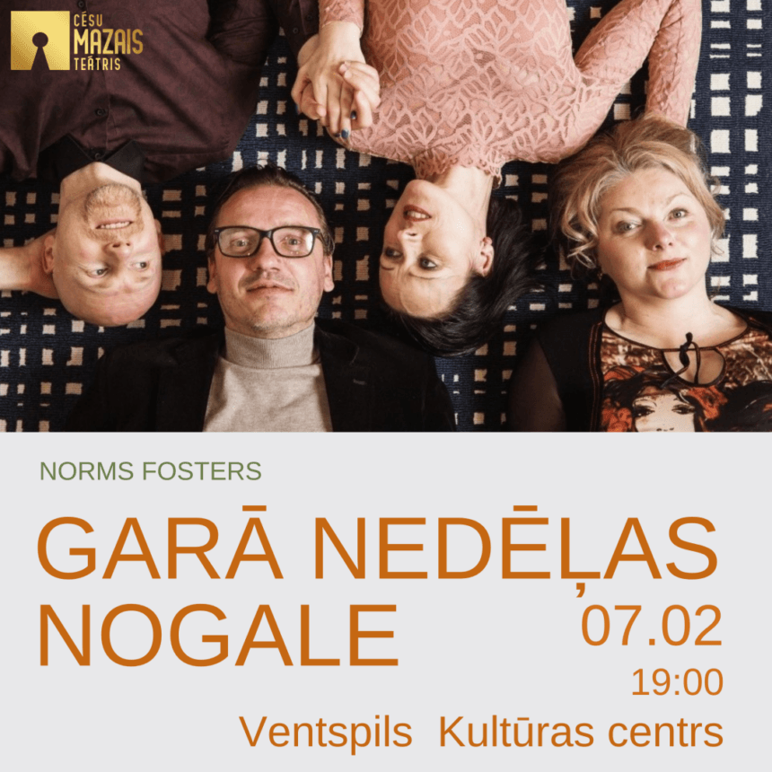 Cēsu Mazā teātra viesizrāde “Garā nedēļas nogale” Ventspils Kultūras centrā 7. februārī plkst. 19.00. Komēdija par diviem precētiem pāriem 40+.