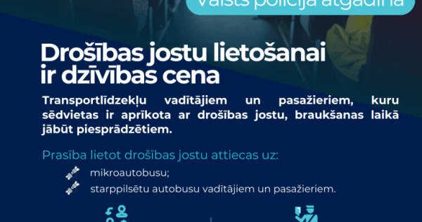 Ņemot vērā 2025. gada janvārī notikušās traģiskās avārijas, kurās smagi cieta un bojā gāja transportlīdzekļu pasažieri, tai skaitā bērni, Valsts policija atgādina: visiem transportlīdzekļu vadītājiem un pasažieriem, kuru sēdvietas ir aprīkotas ar drošības jostu, braukšanas laikā jābūt piesprādzētiem!