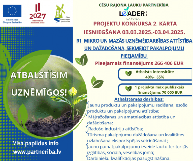 BiedrÄ«ba ā€œCēsu rajona lauku partnerÄ«baā€ izsludina LEADER projektu konkursu 2. kārtuĀ no 2025. gada 3. marta lÄ«dz 2025. gada 3. aprÄ«lim.