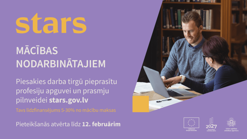 Nodarbināti un pašnodarbināti iedzīvotāji vecumā no 18 gadiem var pieteikties mācībām ar iespēju apgūt darba tirgū aktuālas profesijas un pilnveidot profesionālās prasmes ar 5-30% līdzmaksājumu no kopējās mācību maksas. Mācībām var pieteikties platformā www.stars.gov.lv līdz 12. februārim, izveidojot individuālo mācību kontu.