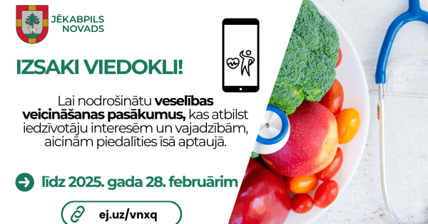 Lai nodrošinātu veselības veicināšanas pasākumus, kas atbilst iedzīvotāju interesēm un vajadzībām, aicinām piedalīties īsā aptaujā.