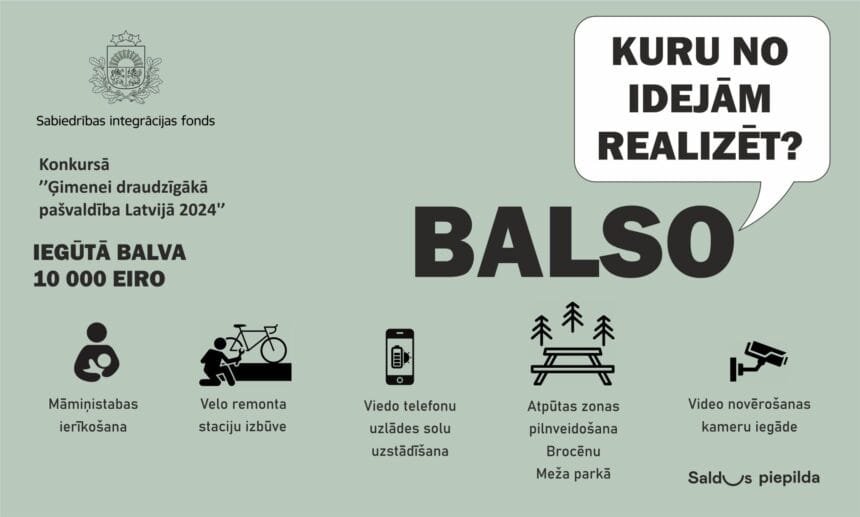 Pērnā gada nogalē, Saldus novads konkursā “Ģimenei draudzīgākā pašvaldība Latvijā 2024” ieguva virstēmas uzvarētāja titulu un naudas balvu 10 000 eiro apmērā. Naudas balva paredzēta ģimenēm draudzīgākas  vides veidošanā, tāpēc aicinām Saldus novada iedzīvotājus balsot par idejām.