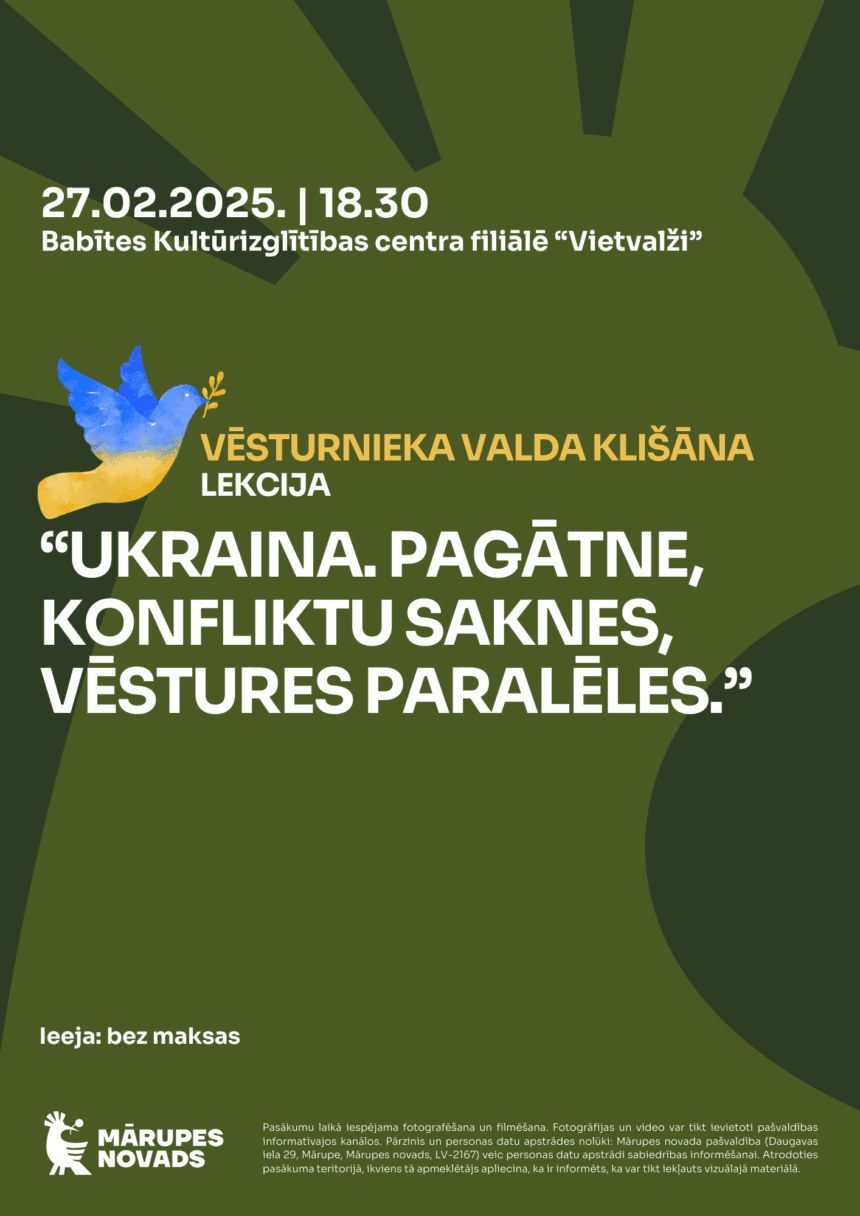 27. februārī pulksten 18.30 Babītes Kultūrizglītības centra filiālē “Vietvalži” Salas pagastā notiks vēsturnieka Valda Klišāna lekcija “Ukraina. Pagātne, konfliktu saknes, vēstures paralēles”.