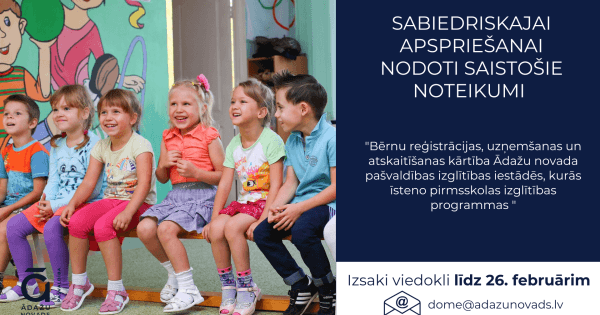 Sabiedrībai viedokļa paušanai šodien, 11. februārī, nodoti saistošie noteikumi “Bērnu reģistrācijas, uzņemšanas un atskaitīšanas kārtība Ādažu novada pašvaldības izglītības iestādēs, kurās īsteno pirmsskolas izglītības programmas“.