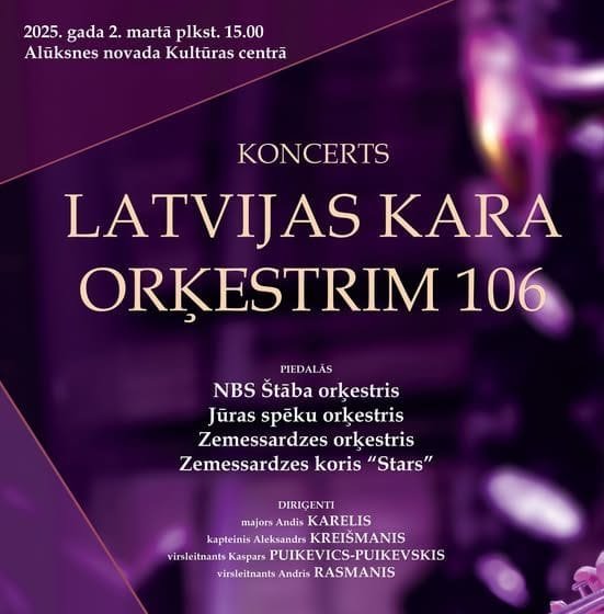 Svētdien, 2. martā, plkst. 15.00 Alūksnes novada Kultūras centrā notiks Nacionālo bruņoto spēku orķestru koncerts, kas veltīts Latvijas armijas pirmā kara orķestra 106. gadadienai. Tajā piedalīsies visi trīs Latvijas militārie orķestri – Nacionālo bruņoto spēku Štāba orķestris, Jūras spēku orķestris un Zemessardzes orķestris. Koncerta mākslinieciskais vadītājs – Nacionālo bruņoto spēku galvenais diriģents majors Andis Karelis. Pie diriģenta pults stāsies arī kapteinis Aleksandrs Kreišmanis, virsleitnants Andris Rasmanis un virsleitnants Kaspars Puikevics-Puikevskis.