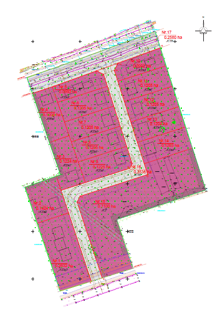 Detālplānojuma risinājums: detālplānojuma teritorijas (3,00 ha) sadale 17 zemes vienībās: vienpadsmit zemes vienības – savrupmāju, dvīņu māju, rindu māju apbūvei, viena zemes vienība – daudzdzīvokļu māju, savrupmāju, dvīņu māju, rindu māju apbūvei, divas zemes vienības – rindu māju apbūvei, viena zemes vienība – ar ierobežotas izmantošanas iespējām saskaņā ar Aizsargjoslu likumu (Biroju ēku apbūve), tikai, kas paredzēta notekūdeņu attīrīšanas iekārtas apsaimniekošanai, labiekārtotai publiskai ārtelpai , divas zemes vienības – transporta infrastruktūras teritorijai.