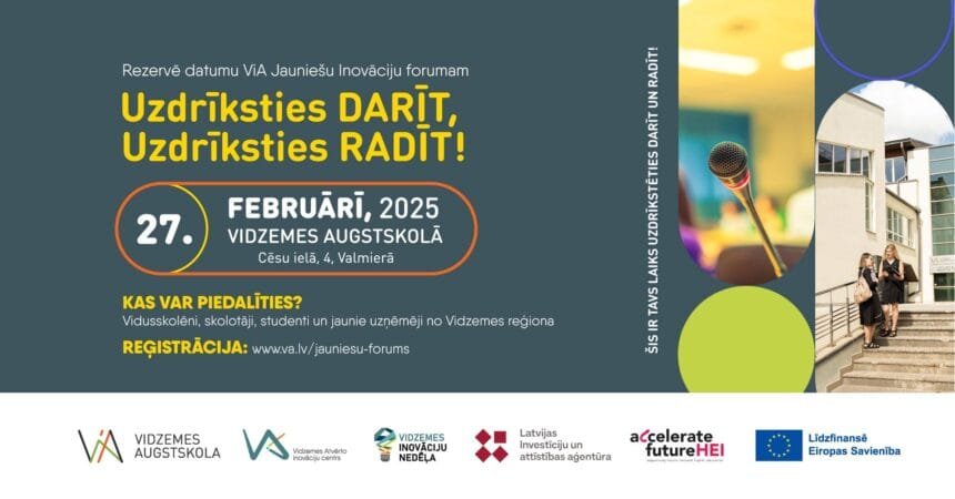 Jauniešu Inovāciju forumu “Uzdrīksties Darīt, Uzdrīksties Radīt!” notiks Valmierā, Cēsu ielā 4 un norisināsies Vidzemes inovāciju nedēļas 2025 ietvaros. Jau septīto gadu pēc kārtas tā pulcēs zinātkāros un tos, kuri jau atzīti par inovācijas lietpratējiem vietējā, nacionālā un starptautiskā līmenī.