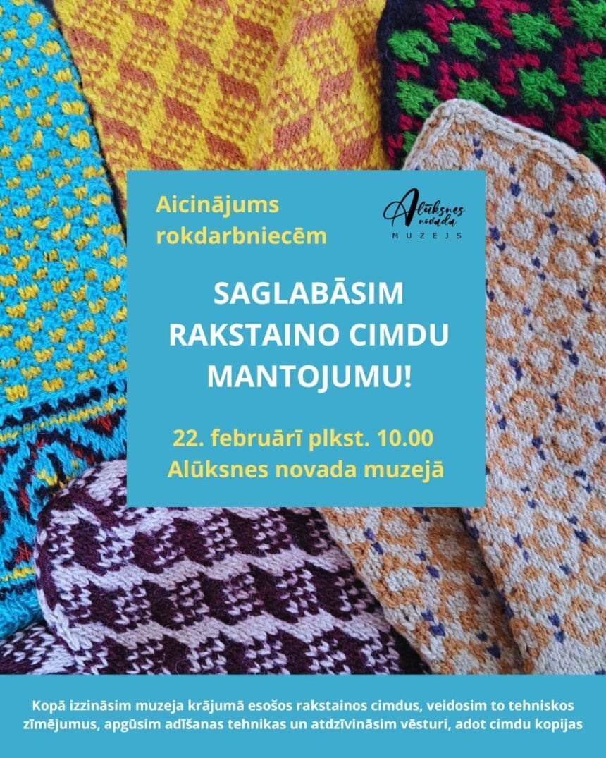 Ja jums sirdij tuva latviešu cimdu rakstu pasaule un vēlaties piedalīties šo tradīciju saglabāšanā, priecāsimies jūs redzēt 22. februārī plkst. 10.00 Alūksnes novada muzejā, Pils iela 74, Alūksne.