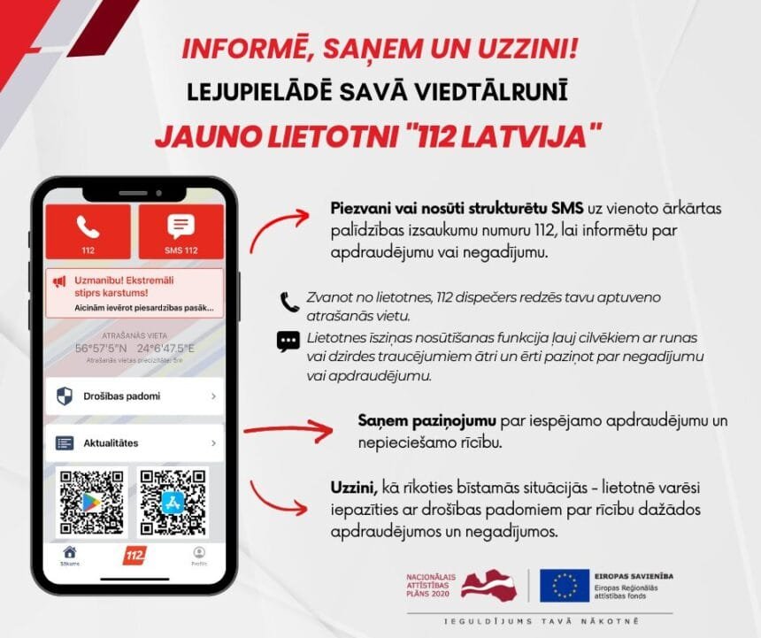 Ikviens Latvijas iedzīvotājs, kuram ir viedtālrunis, aicināts lejupielādēt un izmantot jauno bezmaksas lietotni “112 Latvija”, kas lietotājam sniedz vairākas priekšrocības – iespēju piezvanīt vai nosūtīt īsziņu uz vienoto ārkārtas palīdzības izsaukumu numuru 112, saņemt paziņojumus par iespējamo apdraudējumu un uzzināt, kā rīkoties dažādās bīstamās situācijās.