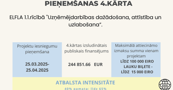 Vairāk informācija par konkursu: https://www.jurkante.lv/2025/02/25/biedribas-jurkante-pazinojums-par-atklatu-projektu-iesniegumu-pienemsanas-elfla-4-kartu-uznemejdarbibas-dazadosana-attistiba-un-uzlabosana/jaunumi/