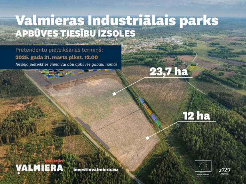 Līdz 31. martam turpinās pretendentu pieteikumu pieņemšana apbūves tiesību izsolēm divām Valmieras Industriālajā parkā esošajām rūpnieciskās apbūves teritorijām 23,7 ha un 12 ha platībā. Pieteikties iespējams vienai vai abām teritorijām – ražošanas ēku būvniecībai, nomas teritorijas labiekārtošanai, iekšējo inženiertīklu un pieslēgumu maģistrālajiem tīkliem izbūvei.