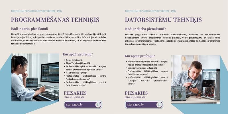 No 4. līdz 10. martam personām vecumā no 18 gadu vecuma ar iepriekš iegūtu vidējo vispārējo izglītību ir iespēja pieteikties datorsistēmu tehniķa, programmēšanas tehniķa vai kiberdrošības tehniķa profesiju apguvei. Personas, kuras platformā www.stars.gov.lv izveidos individuālo mācību kontu (IMK) un tajā aizpildīs mācību ceļu, mācības būs bez maksas.