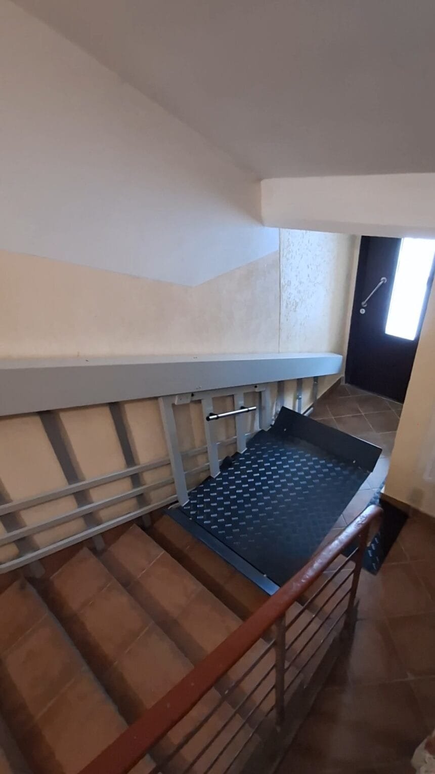 Lai persona patstāvīgi, bez citu palīdzības, varētu iekļūt un izkļūt mājoklī, kāpņu telpā ierīkots elektriskais pacēlājs un veikta teritorijas labiekārtošana pie kāpņu telpas ārdurvīm.
