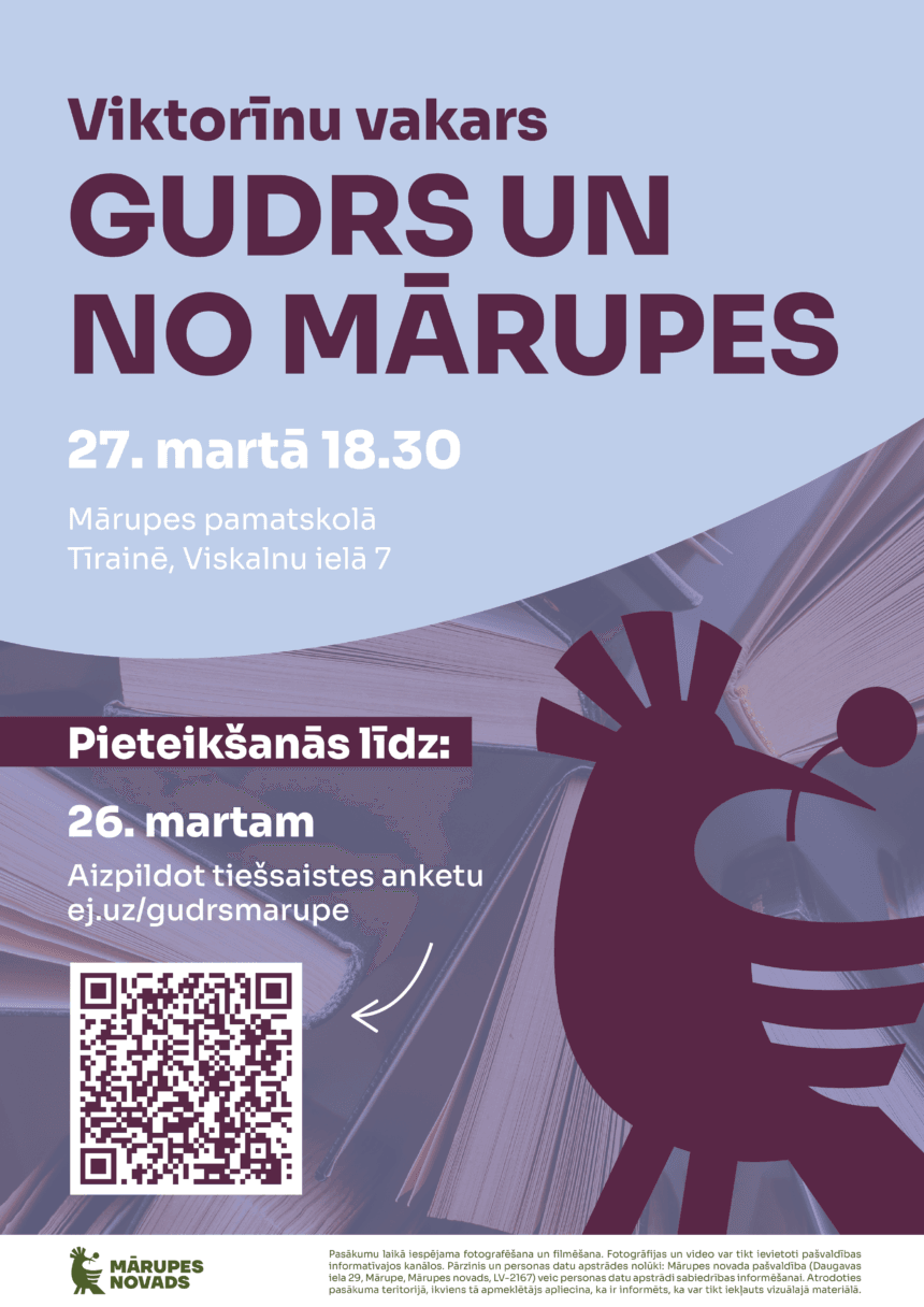 Aicinām pārbaudīt savas zināšanas viktorīnu vakarā “Gudrs un no Mārupes”, kas notiks 27. martā plkst. 18.30 Mārupes pamatskolā!