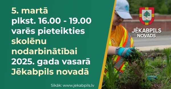 Skolēniem, kuri vēlas vasaras brīvlaikā strādāt labiekārtošanas darbos Jēkabpils novada pagastu un Aknīstes, Viesītes teritorijās, ir iespēja pieteikties dalībai pasākumā 05.03.2025. no plkst. 16.00 līdz 19.00, elektroniski aizpildot pieteikuma anketu: