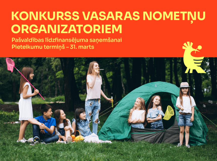 Oranžs vizuālis ar tekstu par iespēju nometņu organizatoriem piedalīties pašvaldības konkursā līdzfinansējuma saņemšanai