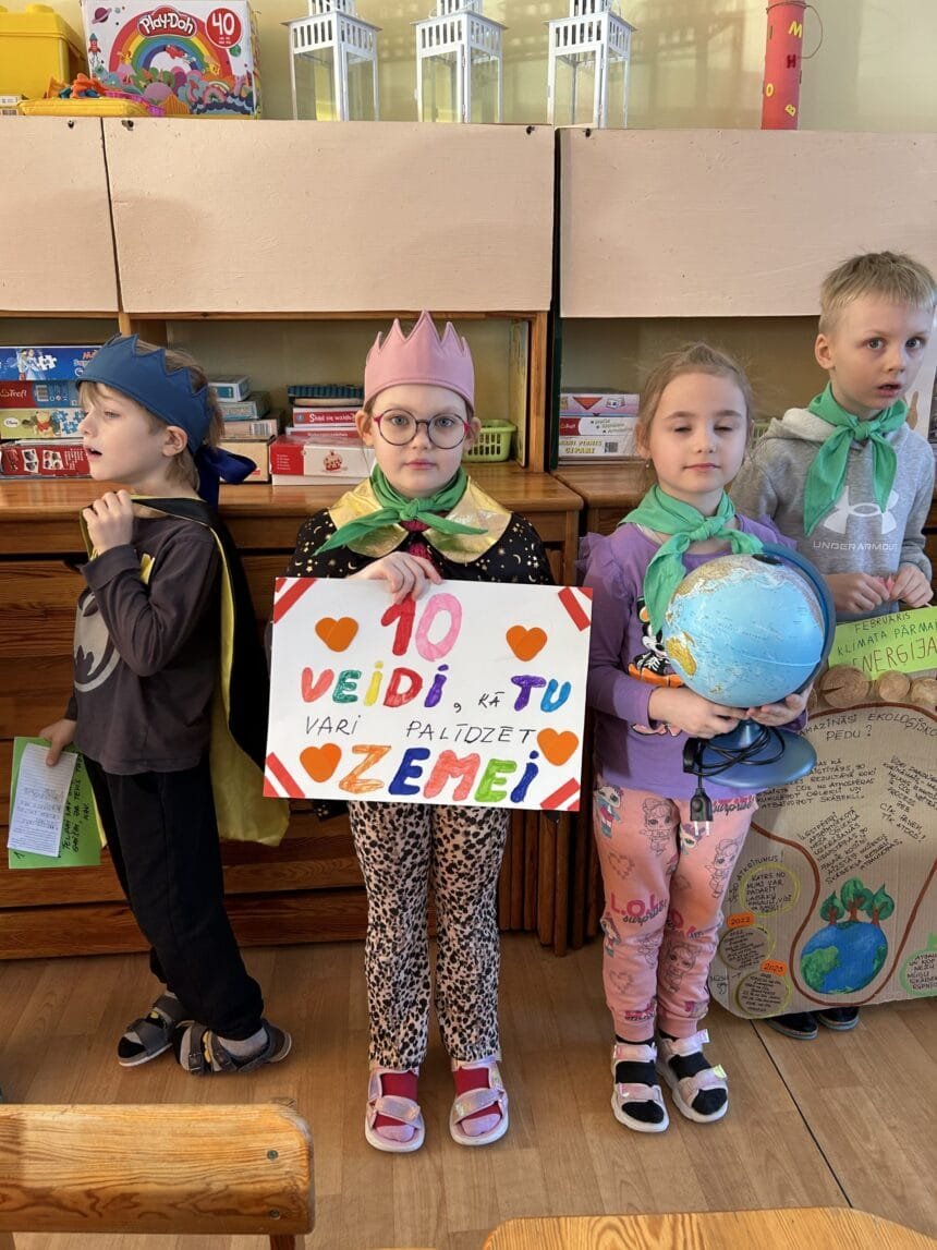 Ar savu tematisko uzvedumu “10 veidi, kā TU vari palīdzēt ZEMEI?” visu 11 grupu bērnus Silto džemperu dienas nedēļā iepazīstina 3.grupas MAZĀS EKOPADOMES bērni (skolotājas A.ŠNEIDERE, S.PUŠPURE). Stāstīja, kas ir klimata pārmaiņas un kā mēs visi kopā varam tās novērst.