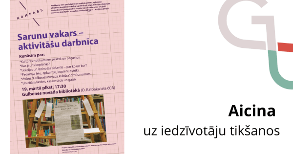 Pētījumprojekta “Sabiedrības saliedētības vektori” ietvaros 19.martā plkst.17.30 Gulbenes novada bibliotēkā kārtējā iedzīvotāju tikšanās “Sarunu vakars – aktivitāšu darbnīca”, kurā aicināts ikviens interesents, lai kopīgi pārrunātu pilsētās un pagastu kultūras dzīvi, to kādas aktivitātes un notikumus mēs vēlamies redzēt savās kopienās un kur esam gatavi iesaistīties, darot un radot.