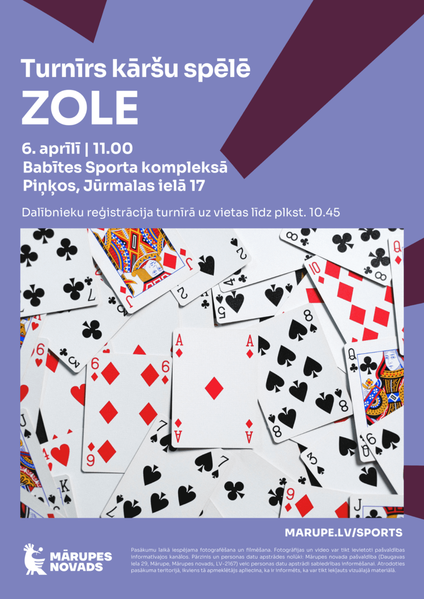 Aicinām uz 2025. gada turnīra kāršu spēlē “Zole” otro posmu, kas notiks 6. aprīlī no plkst. 11.00 Babītes Sporta kompleksā (Piņķos, Jūrmalas ielā 17). Reģistrēšanās turnīra vietā līdz 10.45.
