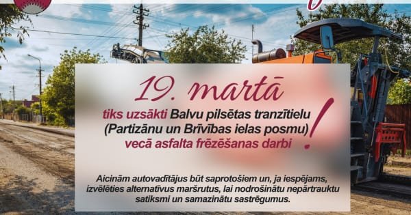 Trešdien, 19. martā, tiks uzsākti Balvu pilsētas tranzītielu (Partizānu un Brīvības ielas posmu) vecā asfalta frēzēšanas darbi.