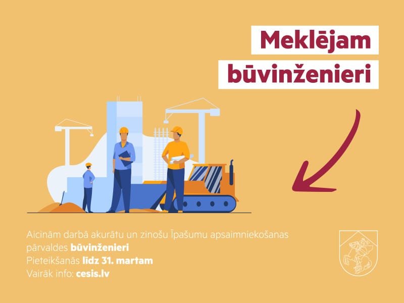 CV, pieteikuma vēstuli iesniegt elektroniski, sūtot uz e-pastu vakances@cesunovads.lv ar norādi „Infrastruktūras nodaļas būvinženieris” līdz 2025. gada 31. martam (ieskaitot).