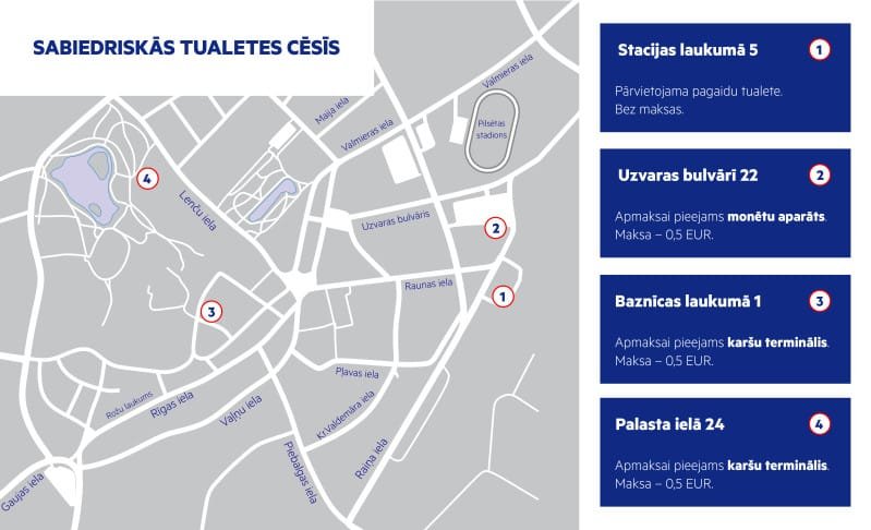 • Palasta ielā 24 (Cēsu Pils parkā) – apmaksai pieejams karšu terminālis. Maksa par pašvaldības publisko tualešu apmeklējumu – 0,5 EUR.