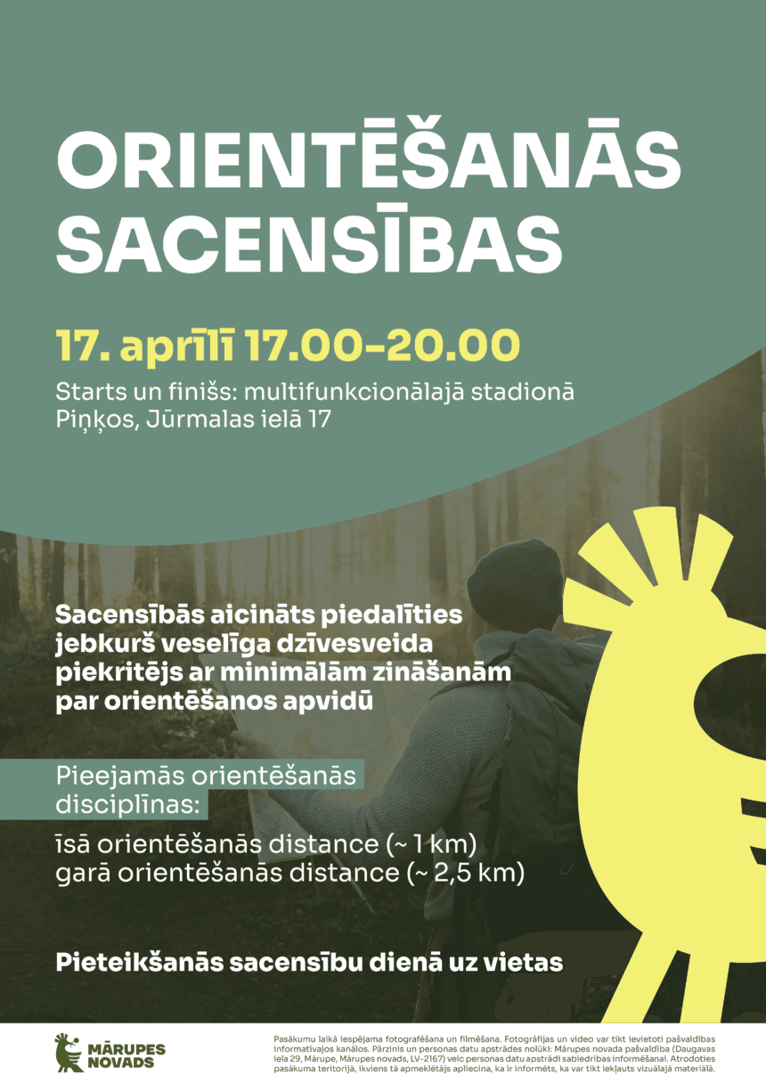 Pirms Lieldienu brīvdienām, 17. aprīlī, laipni aicinām ikvienu veselīga dzīvesveida piekritēju uz azartisku un piedzīvojumiem pilnu vakaru Piņķos. No 17.00 līdz 20.00 notiks orientēšanās sacensības, starts un finišs multifunkcionālajā stadionā Piņķos, Jūrmalas ielā 17.