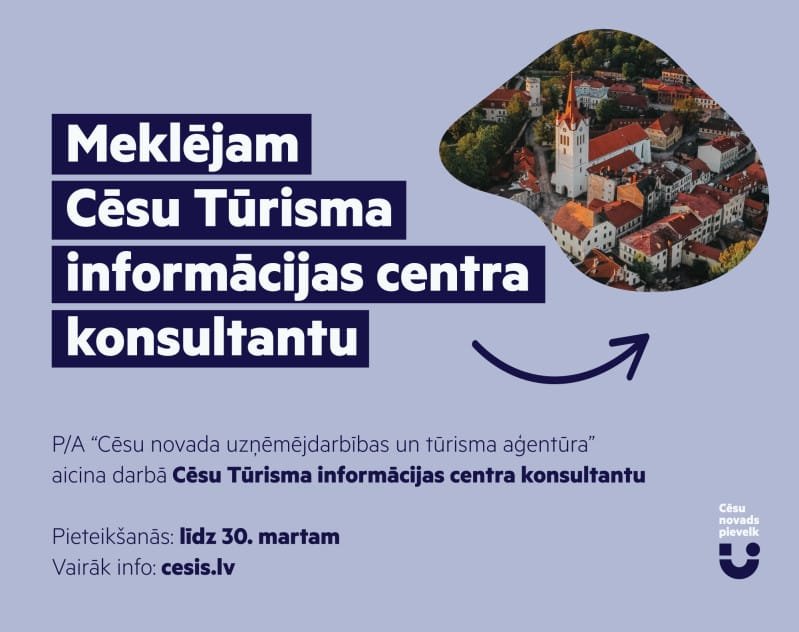 Aicinām darbā mērķtiecīgu un atbildīgu Cēsu tūrisma informācijas centra konsultantu tūrisma informācijas aprites nodrošināšanai.