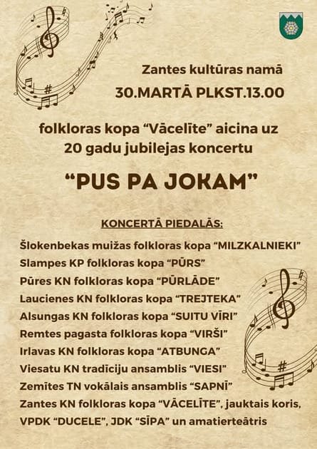 Folkloras kopa “Vācelīte” aicina uz 20 gadu jubilejas koncertu “Pus pa jokam” 30.03.2025 13:00