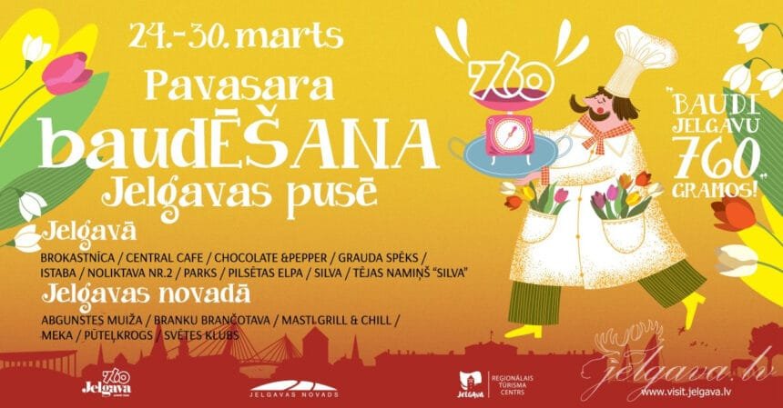 Jelgavas pilsēta šogad svin 760. dzimšanas dienu, un ir tikai likumsakarīgi, ka arī pavasara “baudĒŠANA” būs veltīta Jelgavas jubilejai. Svinot pilsētas nozīmīgo dzimšanas dienu, radīts īpašs gardēžu piedāvājums – “Baudi Jelgavu 760 gramos”, kurā katrs ēdināšanas uzņēmums piedāvās nobaudīt garšas buķeti 760 gramos.