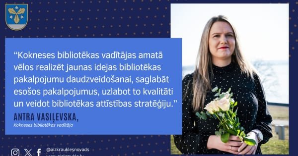 “Kokneses bibliotēkas vadītāja amatā vēlos realizēt jaunas idejas bibliotēkas pakalpojumu daudzveidošanai, saglabāt esošos pakalpojumus, uzlabot to kvalitāti un veidot bibliotēkas attīstības stratēģiju,’’ norādīja Antra Vasiļevska.