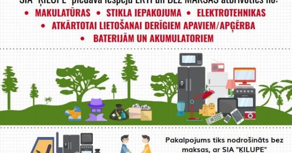 Makulatūras, stikla iepakojuma, sadzīves elektrotehnikas, bateriju, akumulatoru un tīra, atkārtotai lietošanai derīga apģērba un apavu savākšana un izvešana notiks bez maksas ar „Ķilupe” transportu un darbaspēku, piebraucot pie katra klienta individuāli.