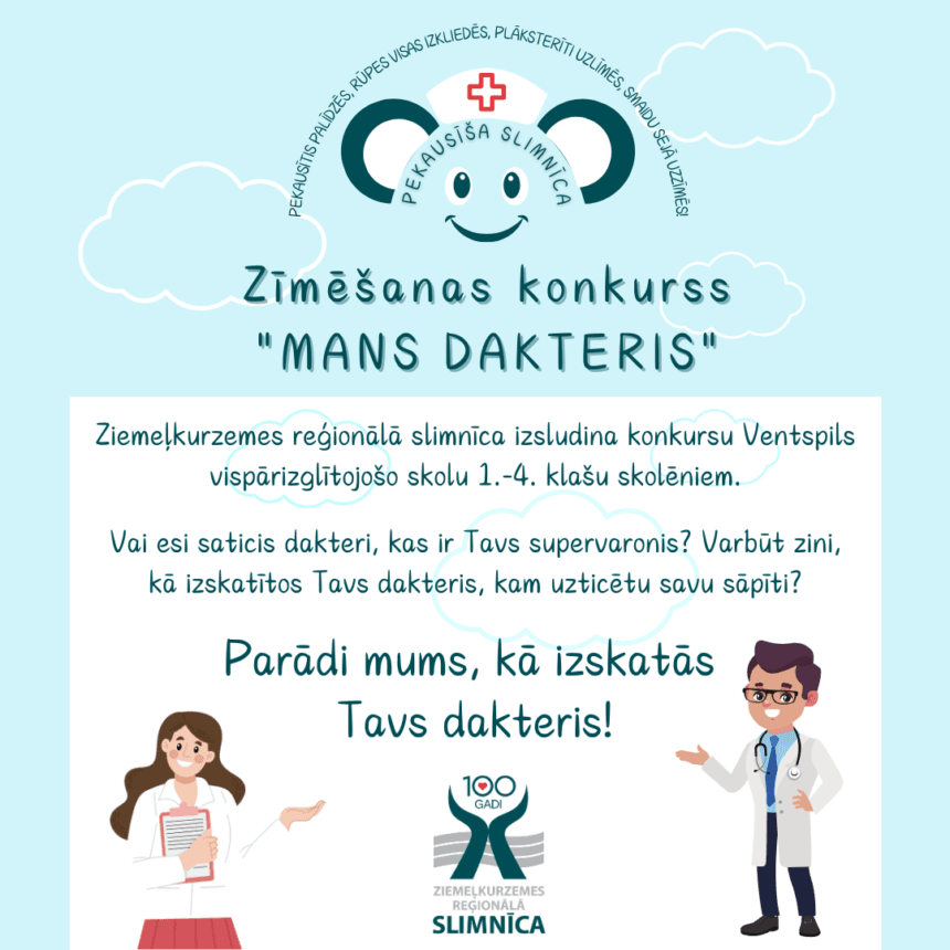 Ventspils valstspilsētas vispārizglītojošo skolu 1.–4. klases skolēni aicināti uzgleznot un līdz šā gada 14. aprīlim iesniegt radošo darbu ar nosaukumu “Mans dakteris”. Tajā var attēlot gan reālo pieredzi ar kādu no ārstiem, gan savu “ideālo” jeb iedomāto dakteri, ja reālas pieredzes vēl nav. Brīva vieta fantāzijai un interpretācijai, attēlojot savu dakteri.