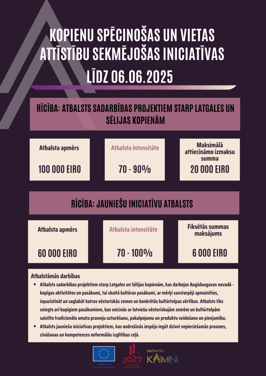 - Atbalsta intensitāte: 70% – pamata likme, 100% – projektiem, kas nodrošina sadarbību starp kopienām.