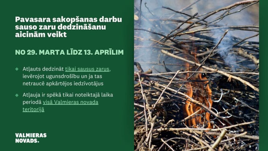 No 29. marta līdz 13. aprīlim Valmieras novadā pavasara darbu sakopšanas laikā pieļaujama sausu zaru dedzināšana ar nosacījumiem: