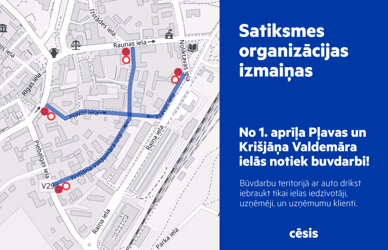No 1. aprīļa sākas vērienīgi būvdarbi Pļavas un Krišjāņa Valdemāra ielās, Cēsīs. Remontdarbos, kas ilgs aptuveni deviņus mēnešus, tiks atjaunots ielas segums, gājēju un velo infrastruktūra, apgaismojums, kā arī atjaunotas apakšzemes komunikācijas un lietus ūdens kanalizācija.