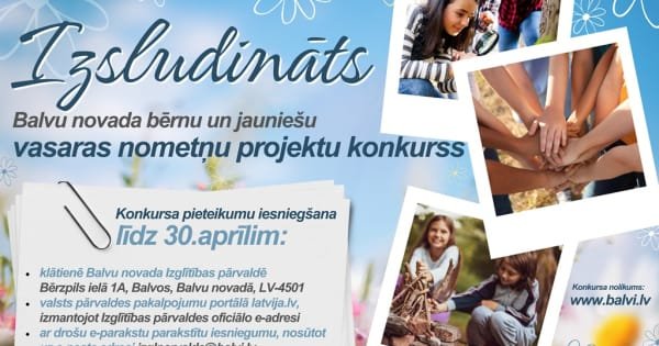Tiek izsludināta pieteikšanās Balvu novada bērnu un jauniešu vasaras nometņu projektu konkursam. Konkursa pieteikumi jāiesniedz līdz 2025.gada 30.aprīlim.