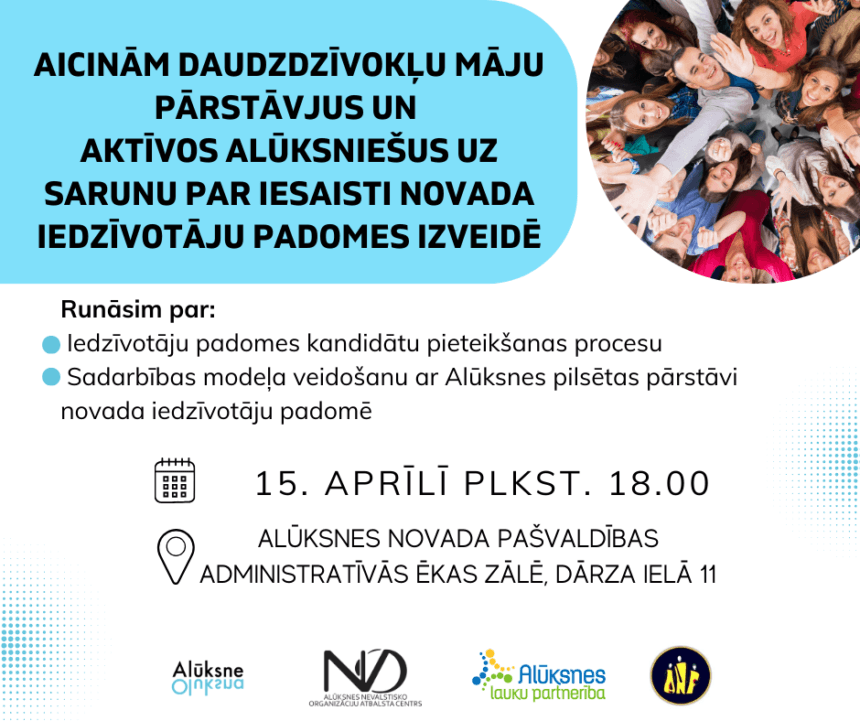 15. aprīlī pulksten 18.00 pašvaldības administratīvās ēkas zālē Dārza ielā 11, Alūksnē, aicinām uz tikšanos Alūksnes pilsētas teritorijā esošo daudzdzīvokļu māju pilnvarotās personas vai māju pārstāvjus un ikvienu aktīvo alūksnieti.