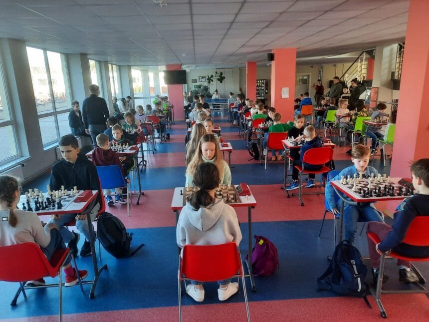 Daudz bērni sēž pie galdiem pa divi un spēlē šahu