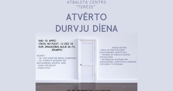 Ceturtdien, 10. aprīlī, no plkst. 12.00 līdz 18.00 ģimeņu atbalsta centrs “Terēze” aicina interesentus uz atvērto durvju dienu, kas notiks Draudzības alejā 26–75, Jēkabpilī.