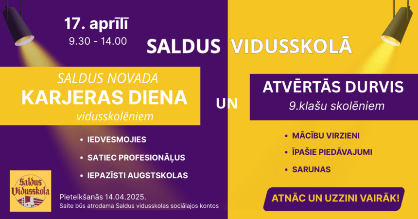 Ikgadējās Saldus novada KARJERAS DIENA un ATVĒRTĀS DURVIS jau 17.04.2025. Saldus vidusskolā!Vidusskolēni un 9. klases skolēni – šī diena ir par JUMS!