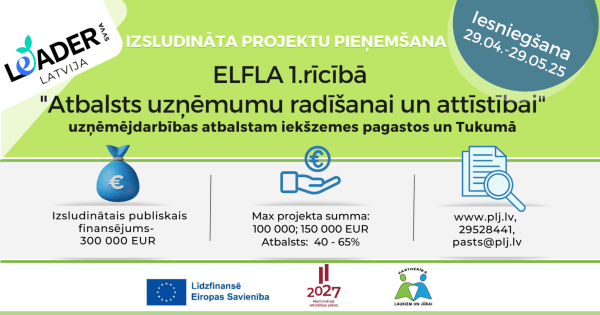 Biedrība “Partnerība Laukiem un Jūrai” izsludina projektu pieteikumu pieņemšanas ELFLA 6.kārtu 1.rīcībā “Atbalsts uzņēmumu radīšanai un attīstībai”– atbalsts uzņēmējdarbības projektiem, kuru īstenošanas teritorija ir: Tukuma pilsēta, Smārdes, Slampes, Džūkstes, Tumes, Jaunsātu, Degoles, Zentenes, Lestenes pagasti.