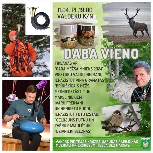 Šo piektdien – 11.aprīlī pl. 19:00 Valdeķu kultūras namā sarunu vakars pie tējas krūzes “DABA VIENO”. Tikšanās ar “GADA MEŽSAIMNIEKS 2024” VIESTURU VALDI DREIMANI, iepazīstot viņa trīs grāmatas “BRĪNIŠĶĪGAIS MEŽS. MEDNIEKSTĀSTI.” un māksliniekiem IVARU FREIMANI un HENRIETI BUDDI, iepazīstot foto izstādi “CEĻOJUMS PUTNU UN ZVĒRU PASAULĒ” un “DZĪVNIEKI GLEZNĀS”. Sarunas papildinās ARTŪRA STRAZDA-STRAZDIŅA muzikālie priekšnesumi ar zvangu un ARTA BALMAŅA ar medību ragu izpildītie medību signāli un citi priekšnesumi. Ieeja bez maksas.