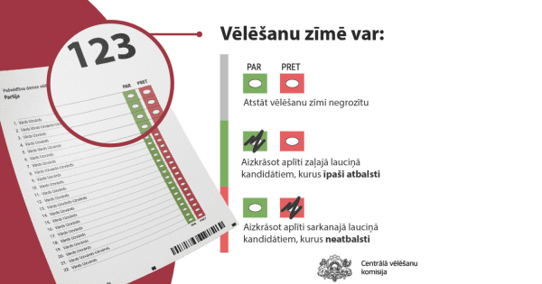 - aizkrāsot sarkanās krāsas lauciņu pretī tam kandidātam, kuru neatbalsta;